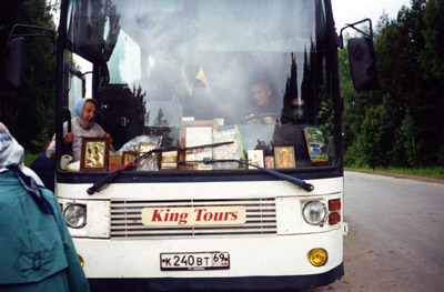 Нам предстоял большой и сложный путь. Мы просили помощи и благословения у царского рода и эту помощь мы ощущали во время всего паломничества. А началось с того, что нас ждал у стен монастыря бельгийский автобус, с надписью "King Tours", который мы перевели как "Царский тур", одного из водителей звали Сергей. Автобус прибыл из Твери, где в Свято-Троицком соборе находятся мощи духовника Марфа-Мариинской обители отца Митрофана Серебрянского, в монашестве - Сергия, причисленного к лику святых.