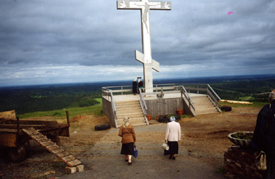 Ночь - в автобусе. Рано утром уже Урал. Пермская область. Белогорский Свято-Никольский монастырь встретил громадным 10 метровым крестом, установленным в память о чудесном избавлении Наследника Цесаревича Николая Александровича от опасности в Японии 29 апреля 1891 года.