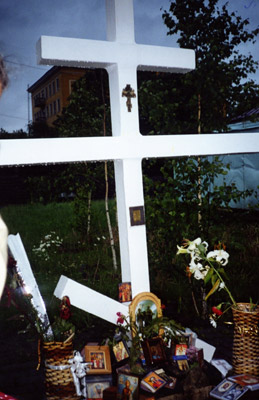 Мы не Россия, мы ее крохотная частичка, которая падает на колени за себя, за своих родных и близких, за тех, кто не может сюда попасть, за своих предков, допустивших это злодеяние. Императора Николая II и его семью большевики везут убивать из Тобольска в Екатеринбург. Почему? Потому что здесь есть Ипатьевский дом - где по их замыслу и должен быть убит последний русский Император, - ведь первый русский Царь из династии Романовых Михаил Федорович был признан народом на царство в 1612 году в Ипатьевском монастыре (Кострома). Большевики убивали не просто Романовых, они убивали три последних столетия российской истории, убивали Россию. В 1824 году Преподобный Серафим Саровский пророчествовал: "Будет Царь, который меня прославит, после чего будет Великая Смута на Руси, много крови потечет за то, что восстанут против этого Царя. Ангелы не будут успевать брать души, все восставшие погибнут, а Бог Царя возвеличит". Сбылось пророчество. На другой стороне Креста надпись: "Царю-мученику, его августейшей семье и верным слугам с покаянием от русского народа". Рядом другой Крест, на месте убийства. За ним часовня преподобномученицы Елисаветы, а рядом тянется ввысь строящийся Храм-памятник на Крови во имя Всех святых в Земле Российской просиявших. Три года назад здесь его не было. Хотели восстановить Ипатьевский дом, а старец о. Николай с Залита благословил строить храм.