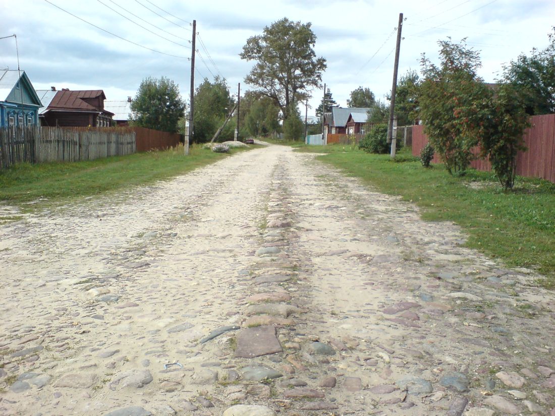 Вы наверное думаете, что едете по следам каторжан. Наивные вы люди. Вы едете ПОЧТИ по следам. Если бы я погнал вас по старой Владимирке (т.е. по тому треку, который записали на свои навигаторы каторжане), то там бы даже самые упёртые джиперы не проехали бы. Современная трасса сильно спрямлена и проходит вдоль старой дороги. И спрямлять её начали ещё в 19 веке. «Обман !!!» – возможно закричите Вы – «Подать нам старую дорогу !!!» Ну что же, как говориться «Любой каприз за Ваши деньги». В деревне Омутищи (N 55.55.702, Е 39.19.387) поворачиваем с трассы налево и по деревенской дороге-раздолбайке едем примерно один километр в Старое Семёнково. Посреди этой деревни (N 55.56.673, Е 39.19.239) сохранился участок старой мощёной Владимирки; ширина дороги около пяти метров, центральная часть выложена более крупными камнями размером до полуметра.