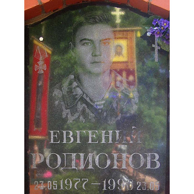 “Здесь лежит русский солдат Евгений Родионов, — начертано на кресте, установленном на его могиле, — защищавший Отечество и не отрекшийся от Христа, казненный под Бамутом 23 мая 1996 года”.