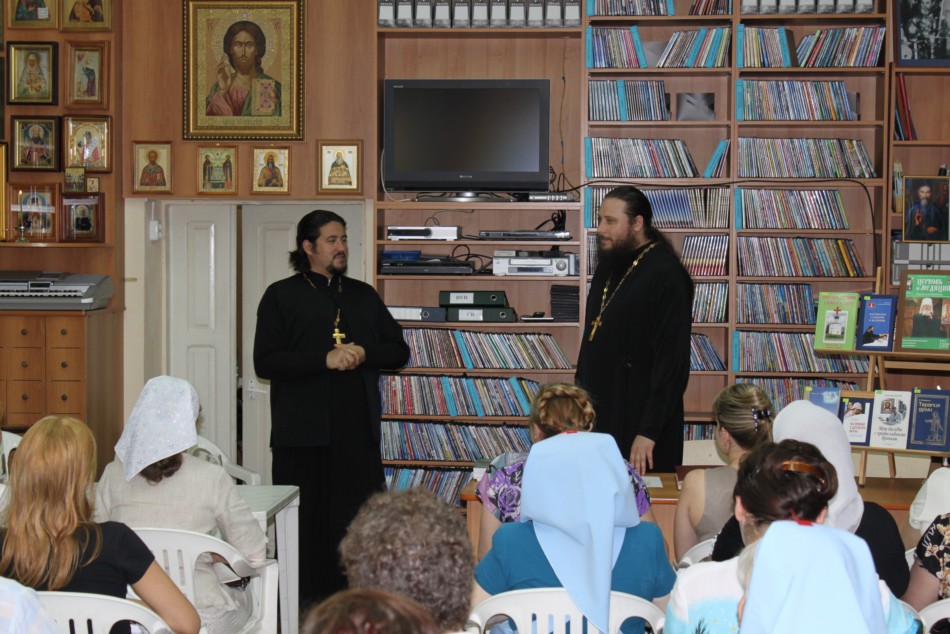 Заключительным этапом поездки стало посещение православного Центра семьи и молодёжи, где ростовских врачей и сестёр милосердия ждали их коллеги. Именно в этих стенах 8 лет назад зародилось общество православных врачей и сестричество во имя св. мчц. Елисаветы. Среди направлений деятельности Центра – пользующийся большой популярностью народный православный университет, который возглавляет протоиерей Алексий Лысиков. А также - библиотека по количеству читателей (1200 человек!) одна из первых в епархии.