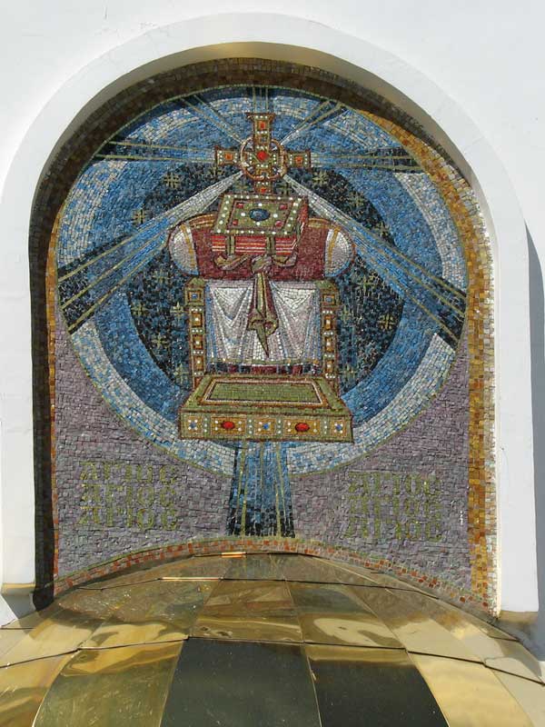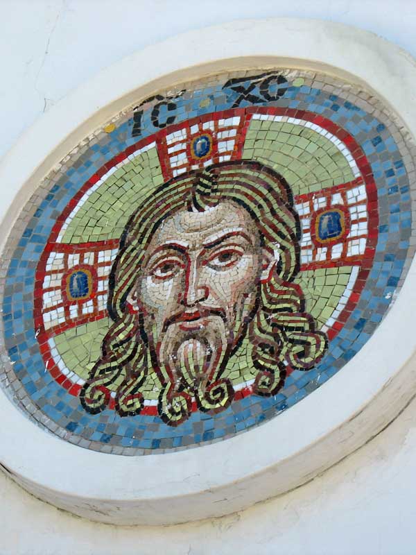 Мозаичная икона Спаса Нерукотворенного, над главным входом в Константино-Еленинский храм.