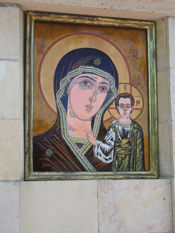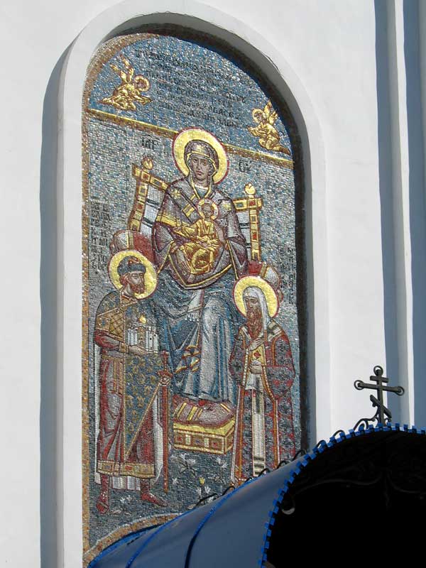 Мозаичная икона Божьей Матери над южным входом в храм.