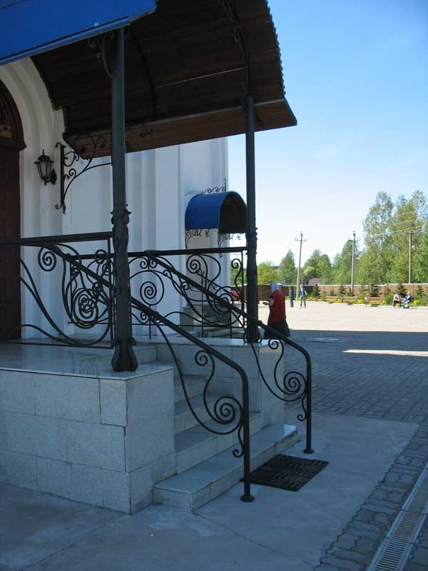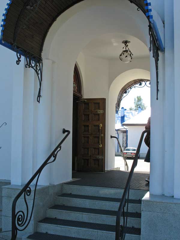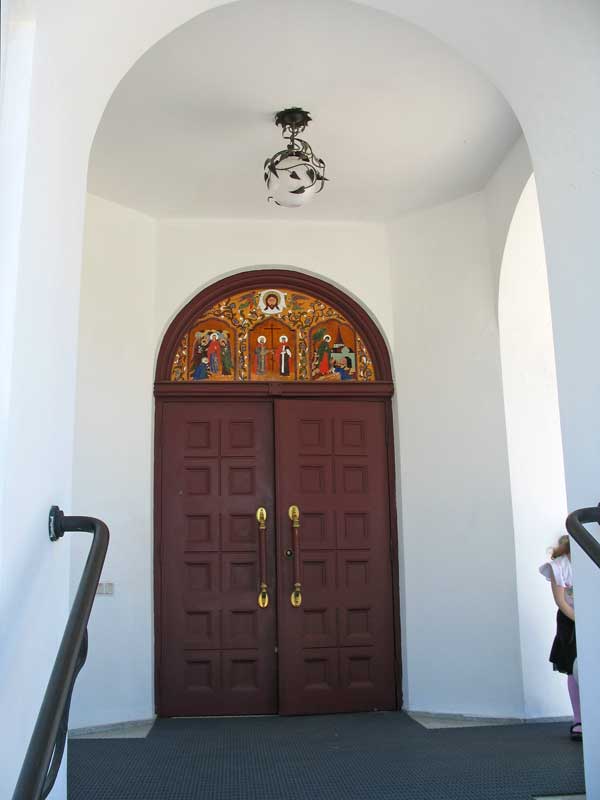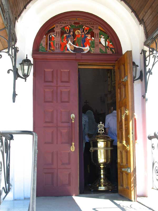 Двери южного входа. В храме читается акафист иконе Божьей Матери "Всецарица".