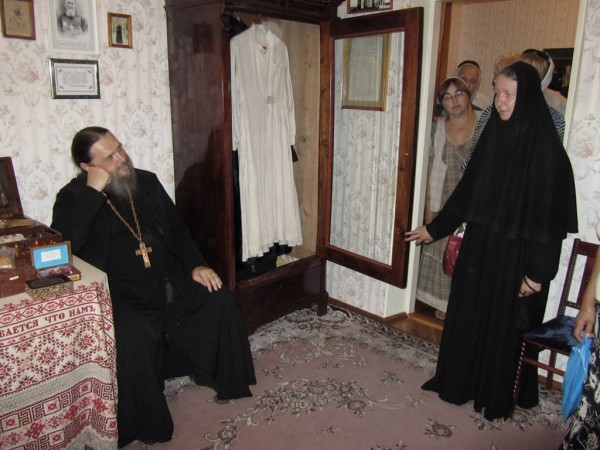 Матушка Евфросиния сказала, что посетителям благословляется присесть на Батюшкин стул. Но наши паломники, часть из которых уже здесь бывала, опередили благословение, и многие успели уже посидеть во время рассказа. Я же показал пример послушания - присел только после того, как матушка разрешила. Матушка подчеркнула это: «Вот видите, даже батюшки по благословению садятся». Тогда я проявил еще большее послушание, спросив: «Матушка, благословите теперь встать». Она же ответила с улыбкой: «Не благословляю. Сидите». Я спросил: «Сколько?». Она ответила: «Сидите всегда», Я остался сидеть, ожидая, чем это закончиться. Между тем, матушка открыла шкаф и разрешила всем приложиться к рукаву зимней рясы св. Иоанна Кронштадтского. Мне было ближе всего прикладываться - я приложился, не вставая с Батюшкина стульчика. Тут матушка и прокомментировала: «Вот поэтому я Вам и сказала не вставать». Благодаря всему этому я просидел на стуле о.Иоанна добрых 5-10 минут.