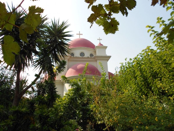Именно православный монастырь приоткрыл нам, каким же был Капернаум на самом деле в период расцвета при Христе. Здесь также, как и в древности, все цветет, растет и зеленеет. Роскошные клумбы диковинных цветов, большой сад цитрусовых с висящими несобранными апельсинами, по дорожкам грациозно бродят павлины, покачивая разноцветными перьями паломникам. Было такое чувство, что мы попали в райский сад. Не верилось, что все это большое хозяйство ведет всего один человек. Храм в новогреческом стиле был построен в 1930-е годы. Внутри играла запись монашеского пения. Вначале решил даже, что идет служба. Мы долго не могли никого увидеть, казалось, монастырь вообще безлюдный. Единственного насельника мы нашли в свечной лавке, он приветливо благословлял нас, одновременно успевая продавать нам иконки и сувениры, а мне так еще и надписать книгу о Святой Земле.