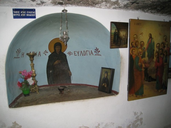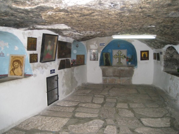 Но самое большое открытие нас ожидало в конце, когда мы уже почти обошли по кругу пещеру и поклонились всем погребениям святых. В нише последнего гроба была написана икона, на которой было всего два слова «Святая Мария». Мы стали выяснять, что это за Мария? Рядом с гробом табличка на греческом языке извещала, что это гроб «Прпп.Ксенофонта, Марии и чад их Иоанна и Аркадия». Меня охватила радость - ведь это небесная покровительница Игумении Таисии в миру. Родительница матушки Таисии Виктория Солопова в благодарность Божией Матери решила посвятить и назвать свою дочь именем Пресвятой Богородицы. Но имя Самой Божией Матери никто не может носить. И у Марии Солоповой небесной покровительницей являлась прп.Мария, память которой совершается в церкви 26 января ст.ст. (8 февраля н.ст.) Именно этот день праздновала матушка Таисия как день ангела, причем помнила его и будучи уже игуменией Таисией. Сохранилось даже поздравление Иоанна Кронштадтского матушке Таисии именно в этот день. В этот день я всегда стараюсь служить Литургию на Леушинском подворье. Признаюсь, никогда не задавался вопросом, где же находятся мощи небесного ангела Таисии. И тут такое неожиданно и радостное открытие.