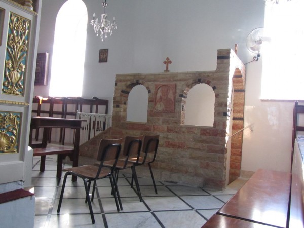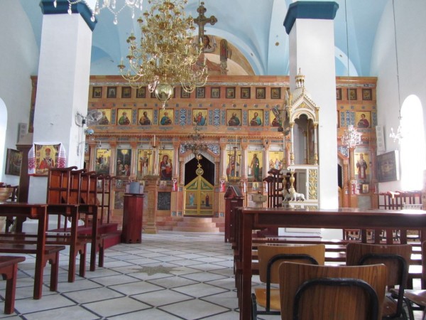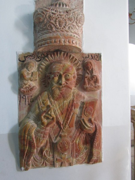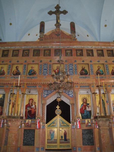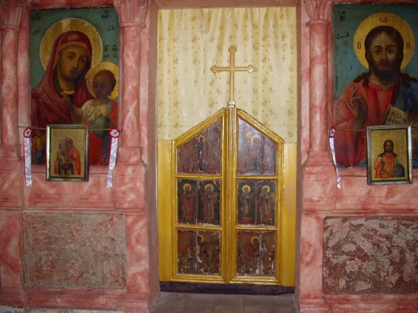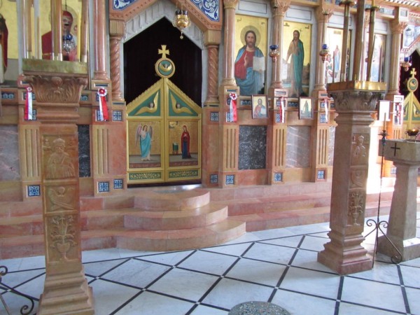В 1925 году за два года полностью были построены стены, купол. И нынешний иконостас был сделан тогда же, в 1925 г. Он выполнен из камня, который называют «розовый Вифлеемский мрамор». Из этого же камня сделаны цельные колонны в храме Рождества Христова. И пол выложен этими же плитами. На самом деле, хотя он и называется так красиво, это - известняк по своим свойствам. Но поскольку он розового цвета и очень трудно обрабатывается, его и назвали «мрамор». А резчики по камню - это как раз бейтджальцы. Если вифлеемцы - это резчики по дереву, бейт-сахурцы это крестьяне большей частью, то бейтджальцы - это как раз каменотесы и прекрасные резчики по камню по сегодняшний день. Если Вы посмотрите, то и сегодня на многих христианских домах увидите резные каменные иконы: вмч.Георгия Победоносца, свят.Николая и других. Это все - бейтджальцы.