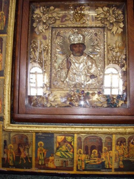 Напротив мощей иконочка в деревянном киоте. Ее история произошла в августе 2007 года. Один прихожанин по имени Майкл принес эту икону к нам в храм и рассказал, что с ним случилось. К нему приходит один человек, персидский еврей, неизвестно, каким образом к нему попала эта икона, но он предложил ее продать и запросил за нее 20.000 долларов. Майкл, когда посмотрел на нее, то понял, что он ее купит за любые деньги. Но сами понимаете, сумма такая, что карман не откроешь и не вытащишь. Он попросил отсрочку. Договорились на три дня. Через три дня Майкл пришел открывать свой магазин, и увидел, что этот продавец его уже ждет, бежит ему навстречу и весь такой как невменяемый, кричит: «Неси его домой. Он сказал, что ты к нему ходишь по Воскресеньям в гости! Вот бери и неси его домой! Оставьте меня уже в покое! Это же невозможно!». Оказалось, что к нему все три ночи являлся некто, по описанию как Ангел Господень, и очень грозно что-то говорил! А на третью ночь приходит к нему старенький священник и говорит: «Отнесите меня уже домой. Хватит меня мучить». Он отвечает: «Да кто Вы такой? Я Вас знать не знаю! Где Ваш дом?! Что Вы все ко мне пристали? Оставьте меня в покое!». На что батюшка ему и отвечает: «Да, сынок, ты меня не знаешь. А вот Майкл ходит ко мне каждое воскресенье в гости, вот пусть меня домой и отнесет!» И пропал.
