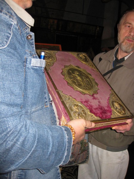 Григорий предложил прочитать эту беседу по большому Евангелию на церковно-славянском языке. Оно было подарено монастырю русскими паломниками еще до революции. Евангелие оказалось столь тяжелым, что я для подстраховки попросил придерживать его на аналое двум нашим паломникам.