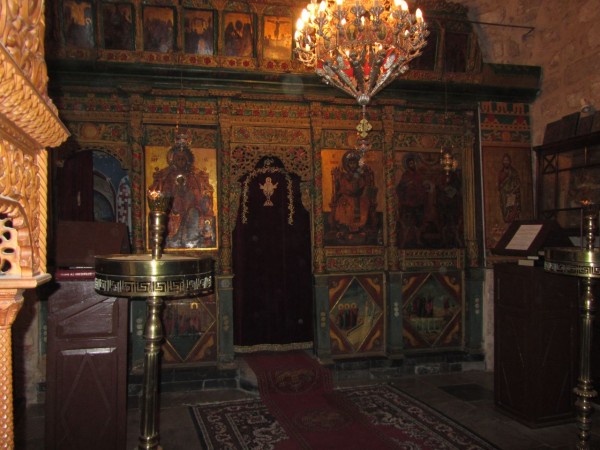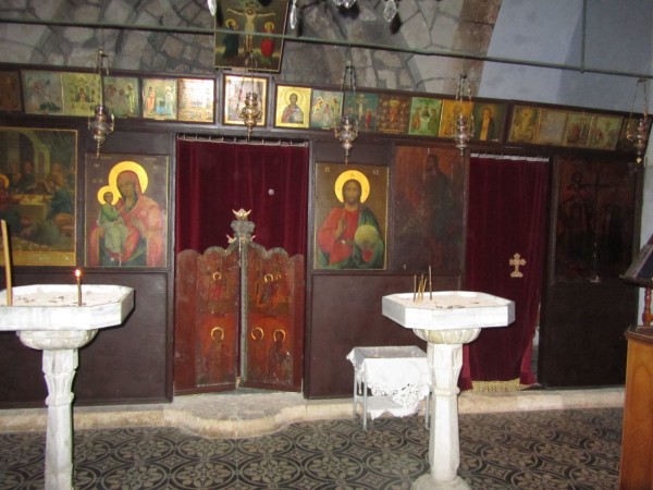 Потом мы вернулись на узкий монастырский дворик. Григорий открыл нам храм, устроенный в память беседы Христа с Никодимом. Исторически здесь существовал дом Шимона ,у которого останавливался Спаситель в Иеруслаиме. В этом доме некая женщина омыла ноги Христа, отерев их своими власами. Этот же дом стал местом одной из самых важных бесед Спасителя. В центре небольшого храма на аналое лежала икона, изображавшая беседу. Такой иконы никогда прежде не видел, хотя она не помешала бы в любом храме на пасхальной седмице в светлый четверг, когда читается 3 глава Евангелия от Иоанна с этой беседой.