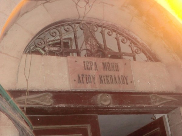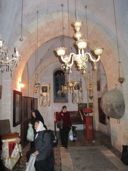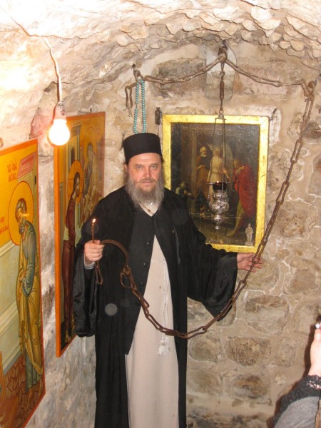 Григорий повел нас дальше в восточном направлении по опустевшим улочкам, которые то расширялись, то сужались. Одно из таких расширений оказалось площадью, но ни одна машина на ней никогда бы не развернулась. Вскоре Григорий привел нас к обещанному сюрпризу, который «нужно посетить именно жителям града святого Петра». Признаюсь, что второй раз я бы сам не смог найти это место. Мы остановились у металлической двери со знаком братства Гроба Господня. Никаких внешних отличительных черт монастырь не имел. Если не прочесть надпись на греческом языке, сообщавшую, что это монастырь св.Никодима, не возможно догадаться, что за стенами находиться обитель. Как оказалось, на территории обители находятся жилыен помещения. Здесь находятся два святых места: 1) народная темница апостол Петр, и 2) дом Шимона, в котором произошла беседа Господа с Никодимом.