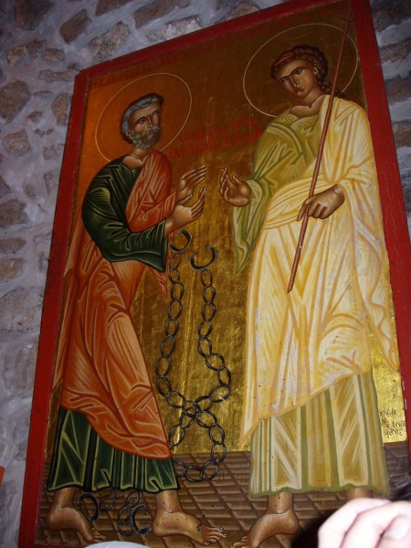 Мы пропели тропарь апостолу Петру и я прочитал 6 главу Деяний Апостолов, где описано это чудо, причем, я читал, находясь прямо в темнице. Яркое чудо живо представилось воображению. На стене темницы помещены три иконы большие иконы, изображающие разные эпизоды жизни апостола, в том числе и его заключение в темницу. Над иконой висят цепи. Григорий поспешно пояснил, что это копии тех, цепей которыми был скован первоверховный апостол. Подлинные были вывезены крестоносцами и находятся в Риме. В честь них установлен особый церковный праздник - поклонение веригам ап.Петра (16/29 января). Мы поклонились этой копии, воздавая таким образом честь подлинным узам страстей апостола.