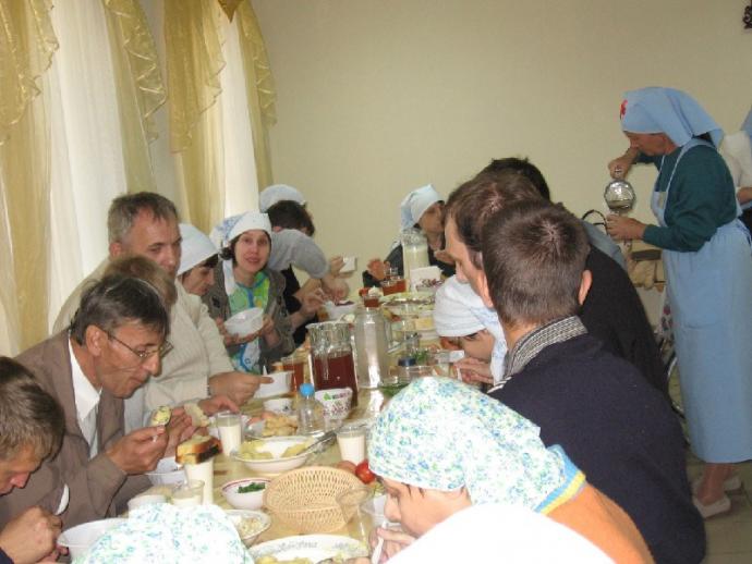 ...В этот раз в путь отправилась довольно большая группа из 36 инвалидов, причём некоторых, из числа так называемых «невыездных», никогда не покидающих стен интерната, взяли впервые. И они не подвели сестёр, вели себя смирно и благоговейно. Как сказала сестра милосердия Ольга Г., ответственная за работу в интернате, с каждым разом их подопечные ведут себя в храме всё осмысленнее, лишь единицы сидели, остальные всю службу, как и полагается, стояли, вслушиваясь в слова молитвенных песнопений. «По лицам было видно, что они молятся, - призналась Ольга Г. - и от этого у нас душе было радостно. Слава тебе Господи!»